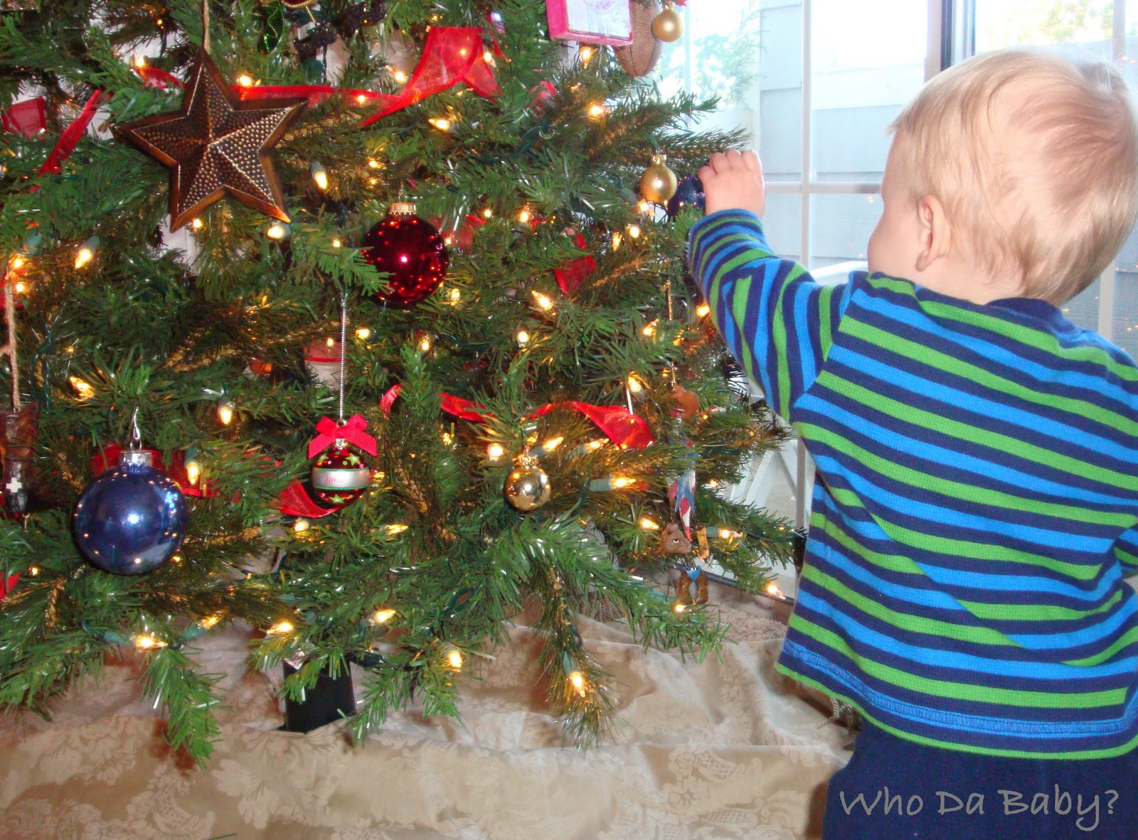 Jake's in bed sleeping quite peacefully, and I'm enjoying a glass of wine, admiring our Christmas decorations, listening to Christmas music, and clearing our camera of pictures from the past couple of weeks. I found this great one of Jakey checking out the tree last weekend when we first put everything out.